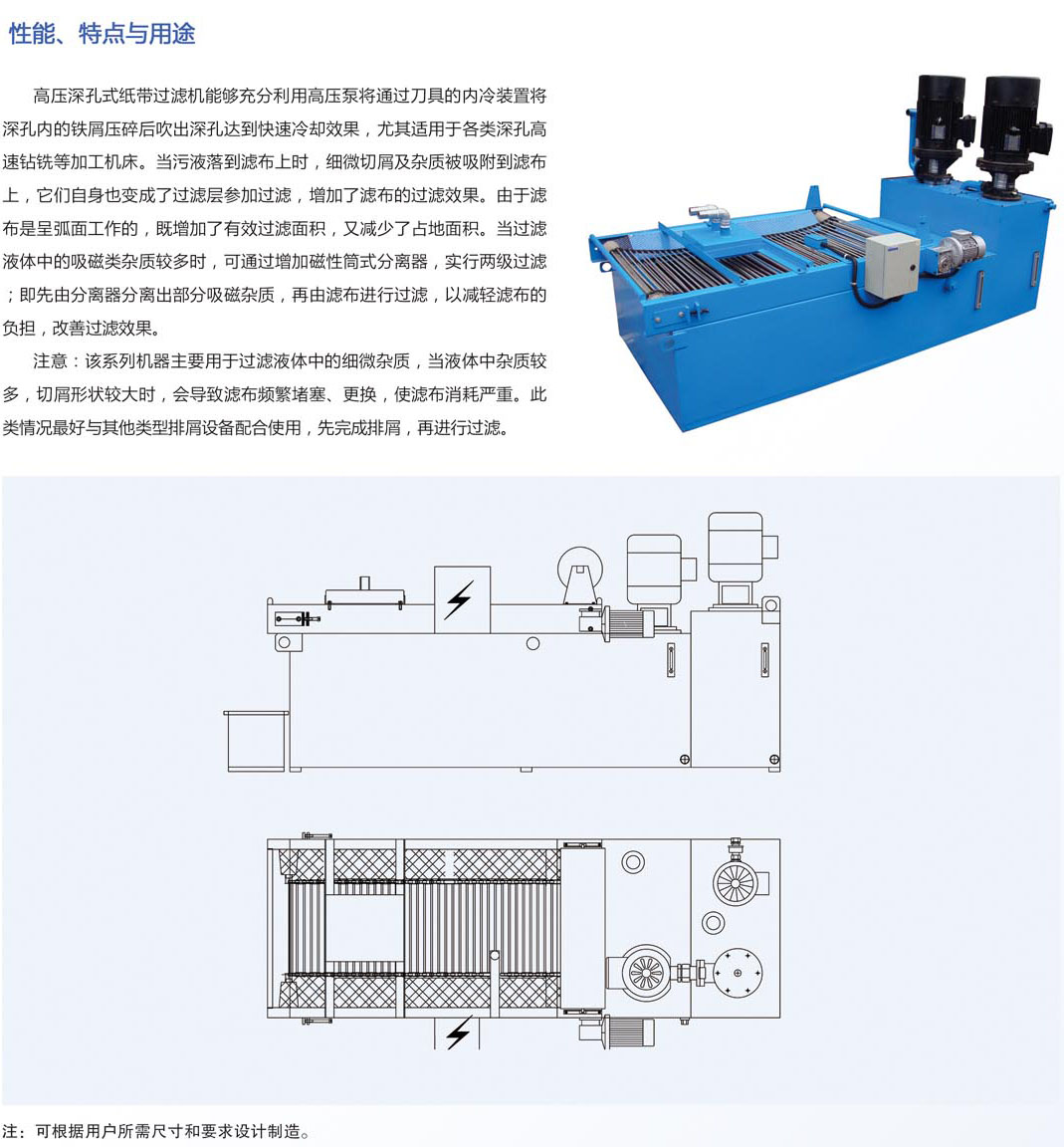 2,強迫式紙帶過濾機,負壓紙帶過濾機、正壓式紙帶過濾機、霍夫曼紙帶過濾機等系列,這種過濾機能夠做到5000L/min的的流量,過濾精度10微米,全自動過濾,含沖刷、除油、增氧系統,這種過濾形式為近幾年發展的趨勢,例如負壓式綜合過濾系統,包含刮屑系統、過濾系統、磁分離系統、增氧系統、除油系統、收紙系統、電器控制系統等組成。