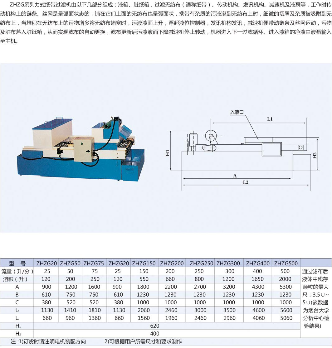 紙帶過濾機是依靠液體自身的重力透過濾布,隔離雜物,從而達到凈化液體目的。傳動機構的鏈條、絲網形成一定的液池深度,濾布鋪在鏈條、絲網上。工作時攜有雜質的污液通過水流緩沖裝置流到無紡布上時,雜質被濾布隔離形成濾餅,濾餅越來越厚,污液液面上升,浮起液位控制器發訊,減速機啟動,拖動濾布,污物及臟布落入臟紙箱,從而實現濾布的自動更換;濾布更新后污液液面下降,減速機停止轉動,機器進入下一步過濾循環。過濾后的純凈液體由液泵輸送至主機。